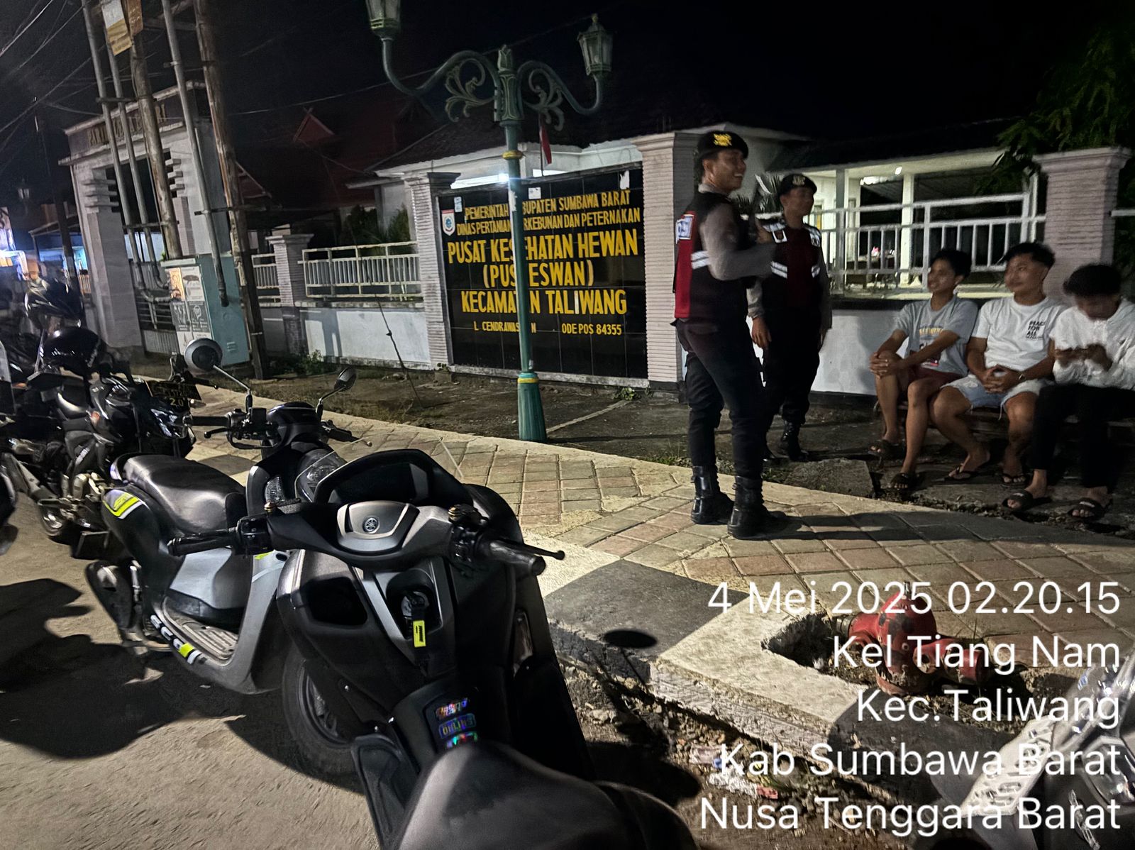 Sumbawa Barat, NTB – Guna menciptakan situasi kamtibmas yang aman dan kondusif, Satuan Samapta Polres Sumbawa Barat menggelar patroli dialogis pada Minggu dini hari, 4 Mei 2025 pukul 02.00 WITA. Kegiatan patroli berlangsung di Lingkungan Tiang Nam, Kelurahan Dalam, Kecamatan Taliwang, Kabupaten Sumbawa Barat, dengan menyasar kelompok remaja yang terlihat sedang berkumpul di beberapa titik.