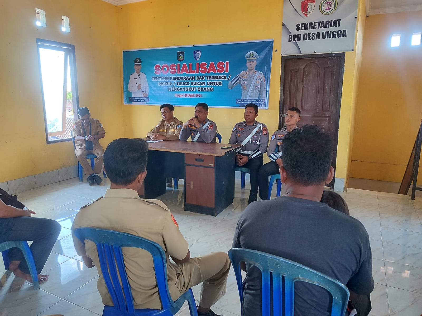 Lombok Tengah (NTB) – Satuan Lalu Lintas Polres Lombok Tengah Sosialisasikan bahaya penggunaan bak terbuka untuk mengangkut orang kepada para sopir angkutan yang ada di Desa Ungga Kecamatan Praya Barat Daya.