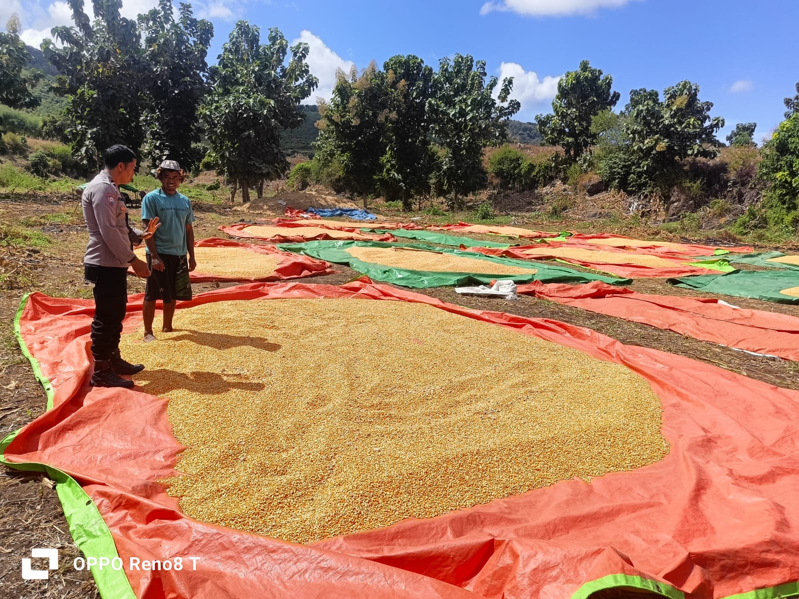Kegiatan penjemuran dilakukan oleh Sdr. Karim, salah satu petani jagung di wilayah tersebut. Bhabinkamtibmas hadir untuk memastikan kegiatan berjalan aman serta memberikan imbauan terkait pentingnya menjaga kadar air jagung agar memenuhi standar pembelian oleh Bulog.
