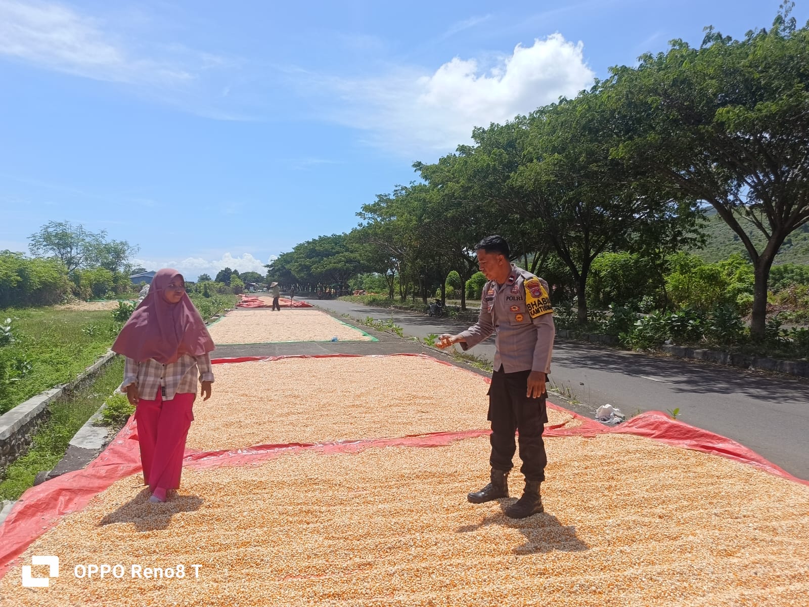 Dalam kegiatan tersebut, AIPDA Husnin mengunjungi lokasi penjemuran jagung milik Sdri. Sumiati. Ia memantau langsung kondisi hasil panen sekaligus memberikan imbauan kepada warga agar memperhatikan faktor cuaca, terutama tingginya curah hujan yang belakangan terjadi.
