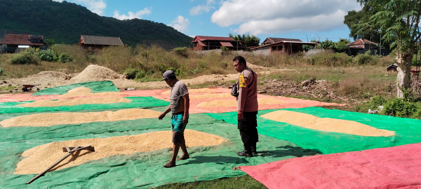 Bhabinkamtibmas Desa Taropo Polsek Kilo, AIPDA I Putu Adi Kamajaya, melaksanakan kegiatan pemantauan proses penjemuran jagung milik Sdr. Hasanuddin di Dusun Nusa Jaya, Desa Taropo, Kecamatan Kilo, Kabupaten Dompu, Jumat pagi sekitar pukul 10.00 Wita.