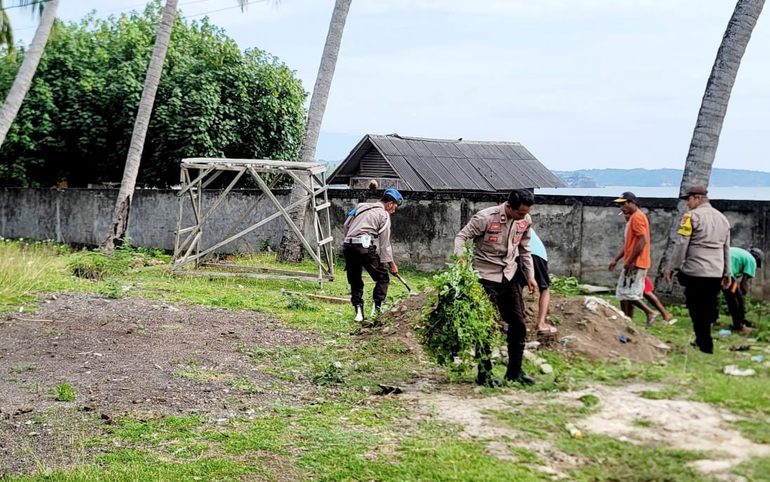 Dipimpin langsung oleh Kapolseknya Iptu Eric As Ari personel Polsek Sanggar Polres Bima Polda NTB menggelar Gotong Royong bersama Warga.