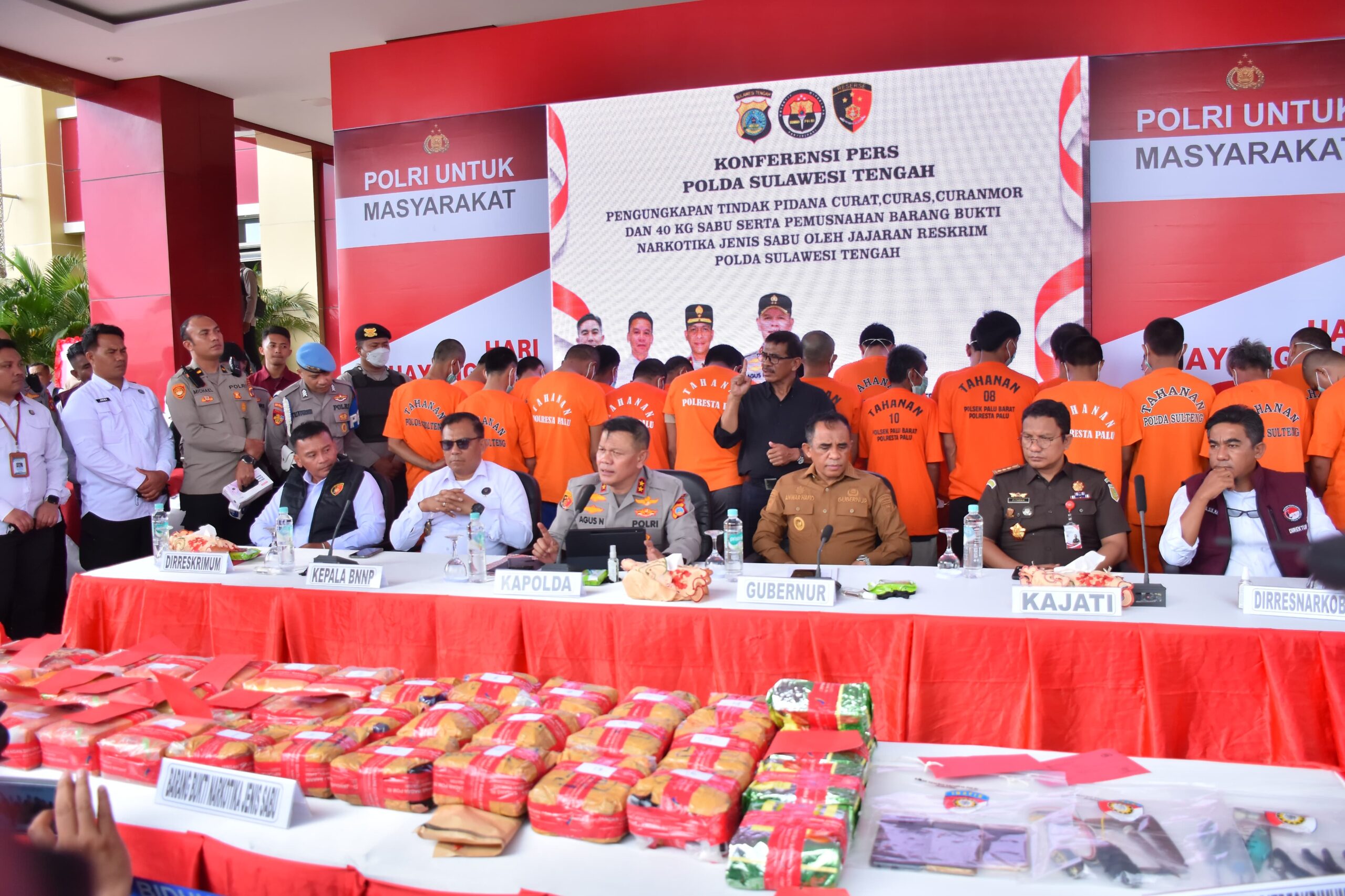 Pemusnahan barang bukti narkotika sabu sebanyak 40 kg turut dihadiri Gubernur Sulawesi Tengah Dr. Anwar Hafid, Kepala Kejaksaan Tinggi Sulteng, Kepala BNN Provinsi Sulteng, Kepala Pengadilan Tinggi Sulteng, Kepala Balai POM Palu, Kepala Pengawasan dan Pelayanan Bea Cukai Pantoloan Palu, Tokoh masyarakat dan pejabat utama Polda Sulteng.