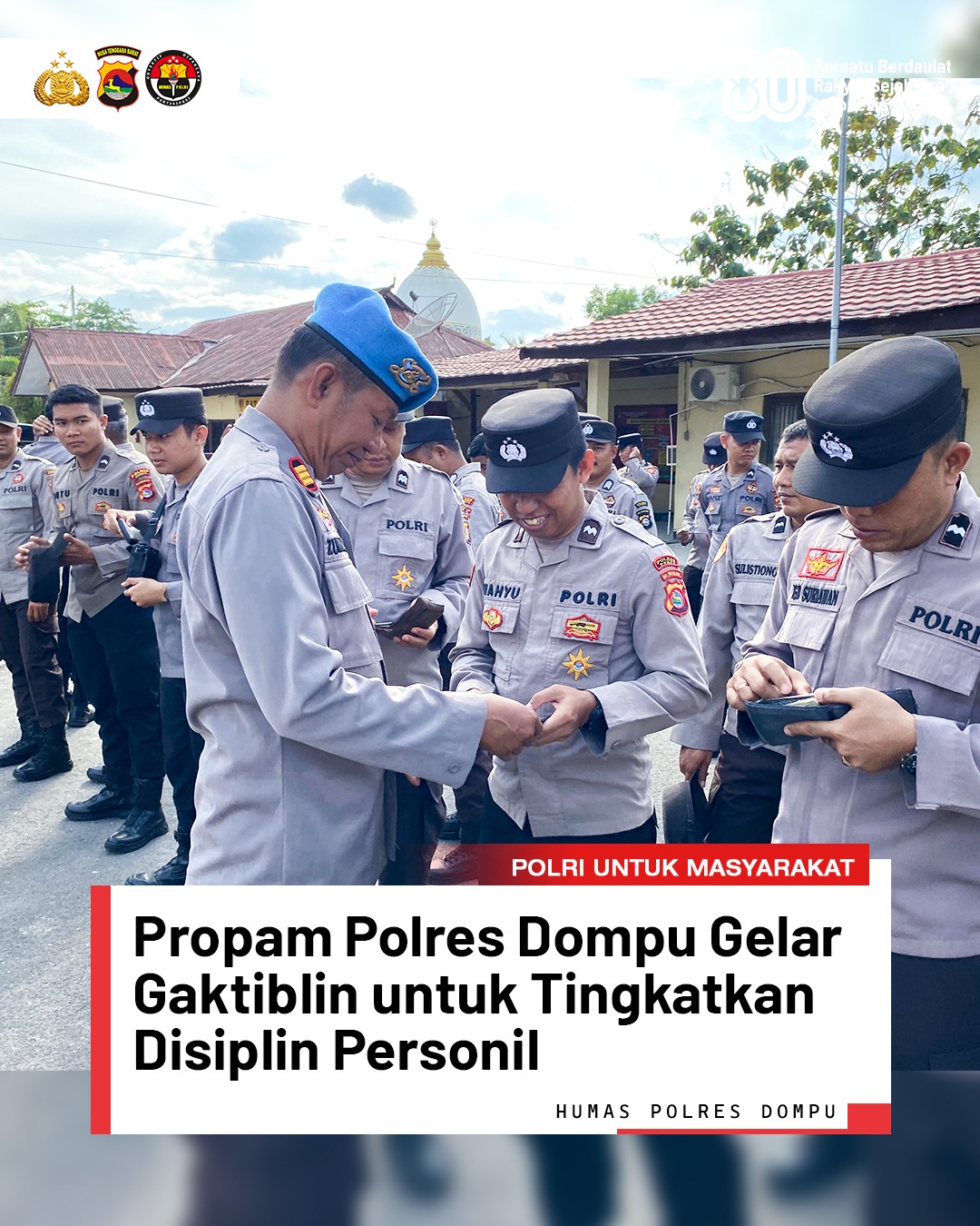 Dalam rangka menjaga kedisiplinan dan meningkatkan profesionalisme di lingkungan internal, Seksi Profesi dan Pengamanan (Propam) Polres Dompu melaksanakan kegiatan Penegakan, Ketertiban, dan Disiplin (Gaktiblin) terhadap seluruh personel Polres pada pukul 07.45 WITA.
