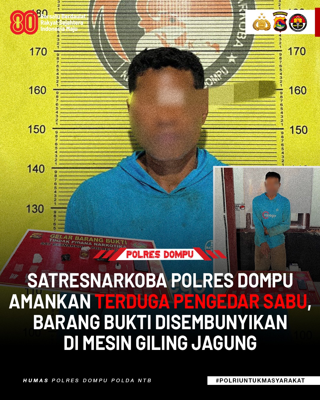 Satresnarkoba Polres Dompu berhasil mengungkap kasus penyalahgunaan narkotika di Lingkungan II, Kelurahan Monta Baru, Kecamatan Woja, Senin (22/9/2025). Seorang petani berinisial S (45) diamankan saat mencoba melarikan diri. Dari hasil penggeledahan, petugas menemukan puluhan paket sabu yang disembunyikan di dalam mesin giling jagung