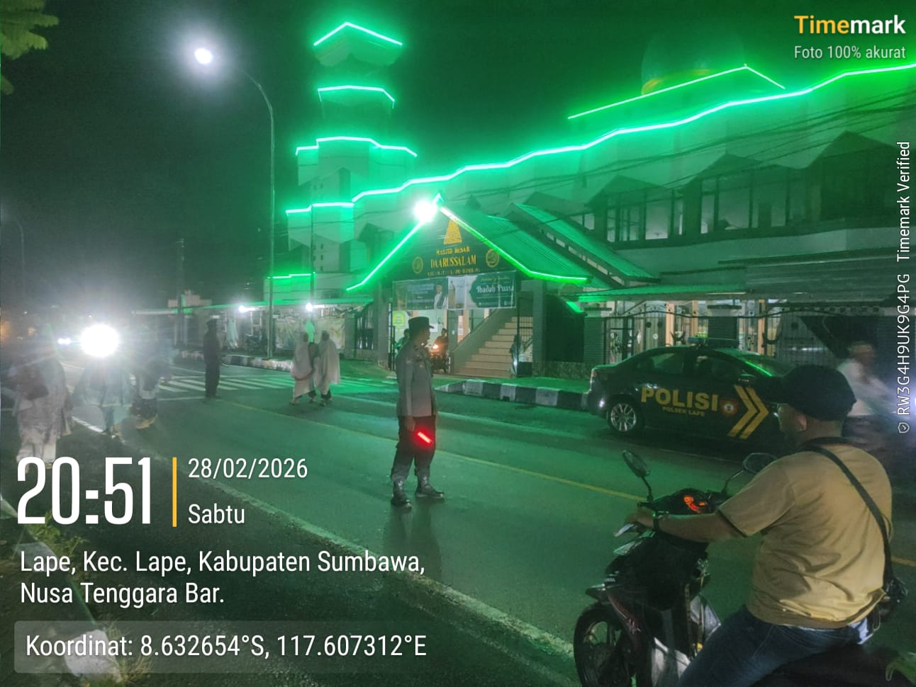 Sumbawa Besar, NTB — Guna memberikan rasa aman dan nyaman bagi umat Muslim yang menjalankan ibadah di bulan suci Ramadan 1447 H, jajaran Polsek Lape Polres Sumbawa melaksanakan pengamanan intensif ibadah Shalat Isya dan Shalat Tarawih. Kegiatan ini dipusatkan di Masjid Besar Darussalam, Desa Dete, Kecamatan Lape, Sabtu (28/02/2026) malam.