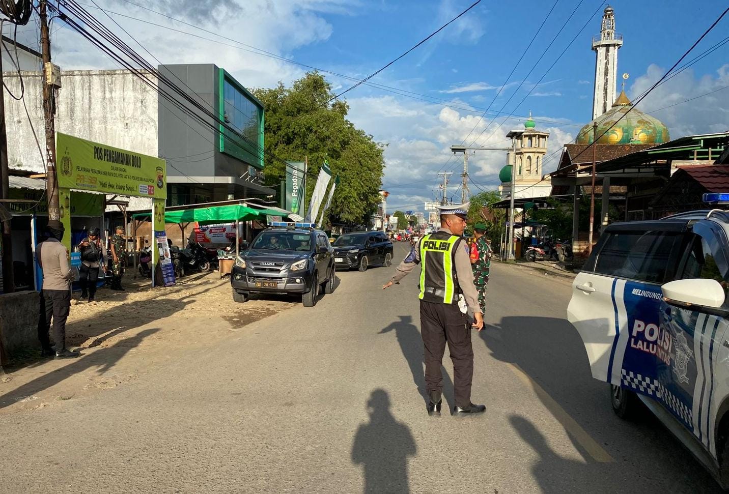 Sejumlah personel tampak berjaga dan mengatur arus kendaraan di depan Pos Pengaman Tente, Pos PAM Bolo dan Pos pelayanan terpadu di depan Bandara SMS Bima.