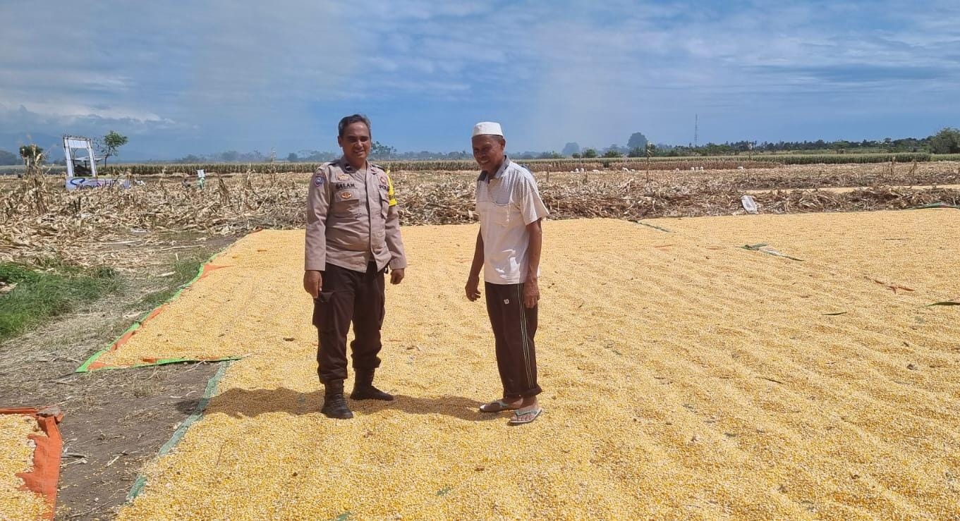 Dalam rangka mendukung Program Ketahanan Pangan Nasional menuju Indonesia Emas 2045, Bhabinkamtibmas Desa Kramat Polsek Kilo, AIPDA M. Nursalam, melaksanakan kegiatan pemantauan lahan jagung milik warga binaannya di Dusun Pali, Desa Kramat, Kecamatan Kilo, Kabupaten Dompu, Selasa (24/3/2026) pukul 10.38 Wita. Kegiatan tersebut dilakukan pada lahan jagung milik H. Abidin (57), dengan luas sekitar 1 hektare. Tanaman jagung varietas Ruby tersebut saat ini telah memasuki usia 120 hari dan dalam proses penjemuran hasil panen. Estimasi hasil panen mencapai kurang lebih 8,5 ton. Dalam pelaksanaannya, AIPDA M. Nursalam turut memberikan motivasi serta pembinaan kepada warga binaannya agar terus meningkatkan produktivitas pertanian. Ia juga mengimbau agar petani tetap menjaga kualitas hasil panen serta memanfaatkan lahan secara optimal guna mendukung ketahanan pangan. “Kami mengajak para petani untuk terus semangat dalam bertani, karena sektor pertanian memiliki peran penting dalam menjaga ketersediaan pangan dan meningkatkan kesejahteraan masyarakat,” ujar AIPDA Nursalam. Kapolsek Kilo, IPTU Rusnadin, S.H., menyampaikan bahwa kehadiran Bhabinkamtibmas di tengah masyarakat tidak hanya untuk menjaga keamanan, tetapi juga sebagai bentuk dukungan terhadap program pemerintah, khususnya di bidang ketahanan pangan. “Melalui kegiatan pemantauan ini, kami ingin memastikan bahwa para petani mendapatkan perhatian dan pendampingan, sehingga hasil pertanian dapat maksimal dan berkontribusi bagi ketahanan pangan daerah,” ungkapnya. Sementara itu, Kapolres Dompu AKBP Sodikin Fahrojin Nur, S.I.K melalui Kasi Humas Polres Dompu IPTU I Nyoman Suardika menegaskan bahwa jajaran Polres Dompu terus berkomitmen mendukung sektor pertanian sebagai bagian dari program strategis nasional. “Polri akan terus hadir di tengah masyarakat untuk memberikan dukungan nyata, termasuk dalam sektor pertanian. Pendampingan kepada petani diharapkan mampu meningkatkan produksi serta memperkuat ketahanan pangan nasional,” jelasnya. Dengan sinergi antara aparat kepolisian dan masyarakat, diharapkan program ketahanan pangan dapat berjalan optimal dan memberikan manfaat nyata bagi kesejahteraan masyarakat, khususnya di Kabupaten Dompu.
