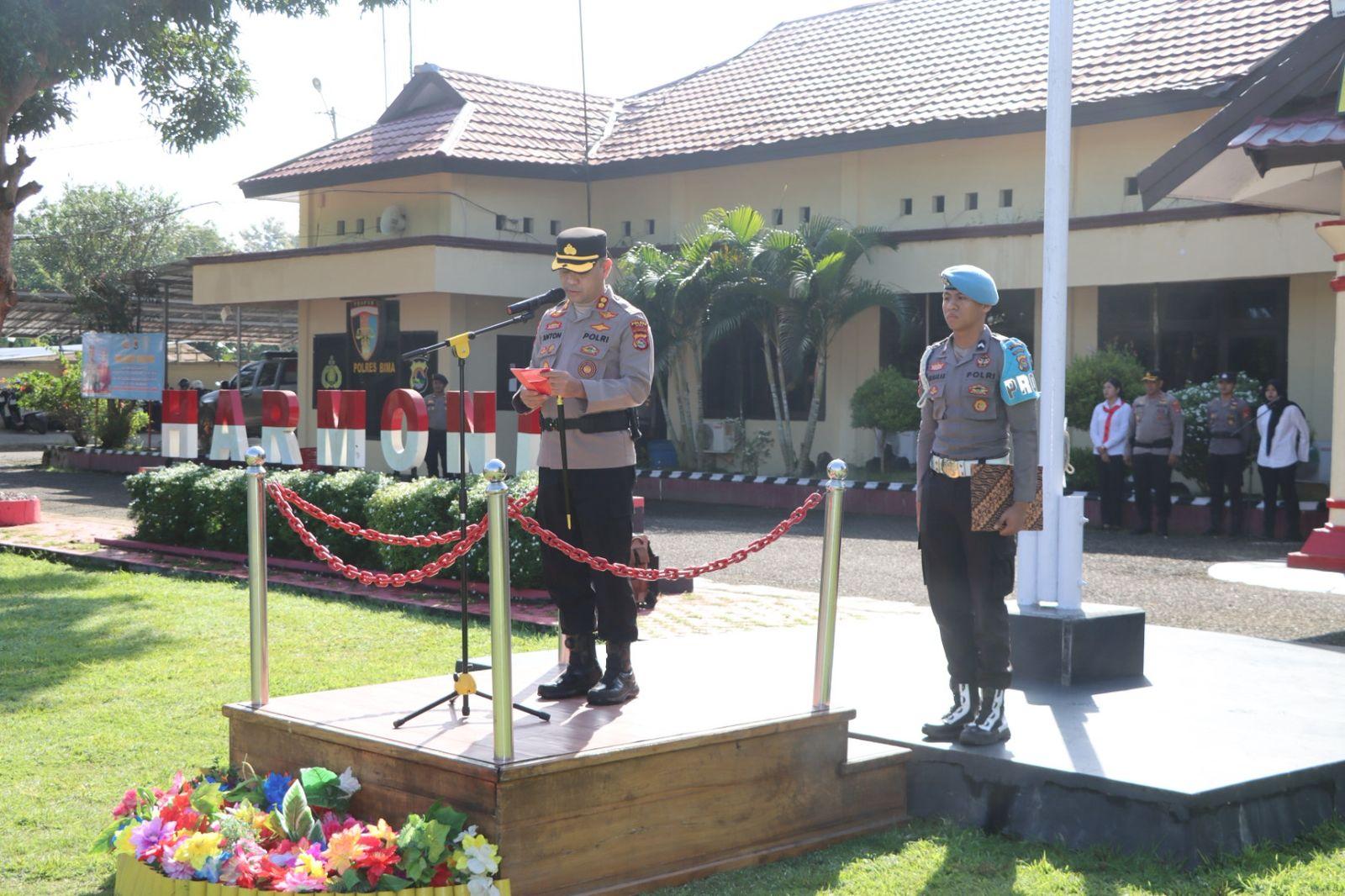Polres Bima Kabupaten Polda NTB menggelar upacara pengecekan kesiapan personel, peralatan, dan sarana prasarana untuk menghadapi situasi darurat atau potensi gangguan keamanan/bencana alam.