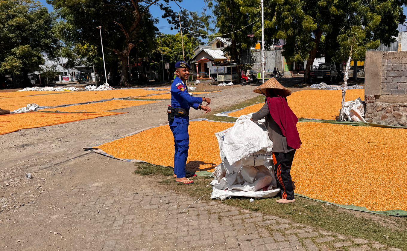 Dengan seragam dinas lengkap dibawah terik matahari terlihat sejumlah personel Satpolairud membantu warga yang sedang menjemur jagung.