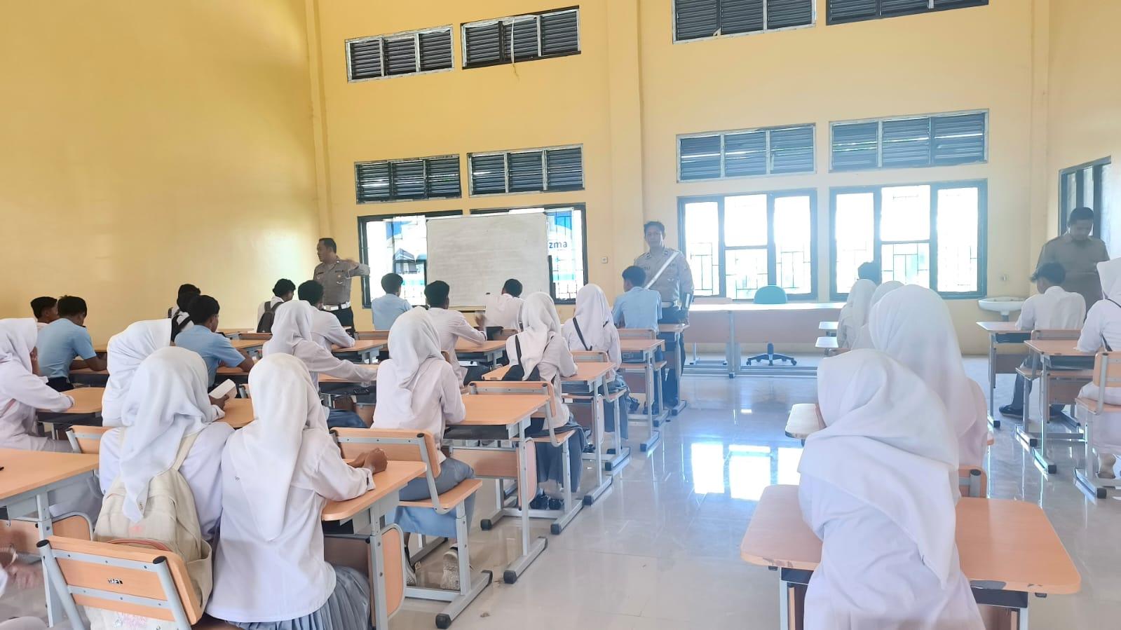 Personel Satlantas memberikan materi tentang pentingnya mematuhi peraturan lalu lintas, penggunaan helm standar SNI, larangan berkendara bagi pelajar yang belum memiliki SIM, serta etika berlalu lintas di jalan raya.